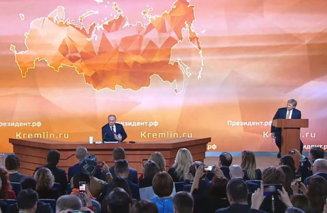 В зале появился Дмитрий Песков — пресс-конференция начнется с минуты на минуту.