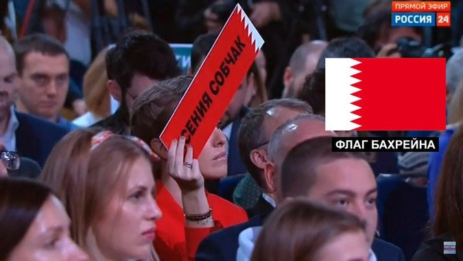 Все еще не задала свой вопрос Ксения Собчак: в соцсетях переживают, связано ли это с тем, что она пришла на мероприятие с перевернутым флагом Бахрейна в руках.
