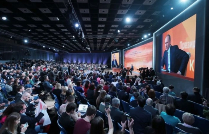 13 пресс-конференция Путина стала абсолютным рекордсменом по числу аккредитованных журналистов: места в зале быстро закончились, представителям СМИ приходится толпиться в проходах. Тем временем в зале объявили пятиминутную готовность до старта пресс-конференции.
