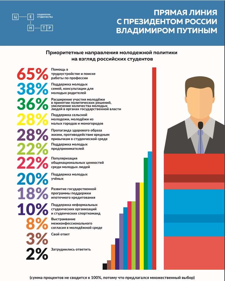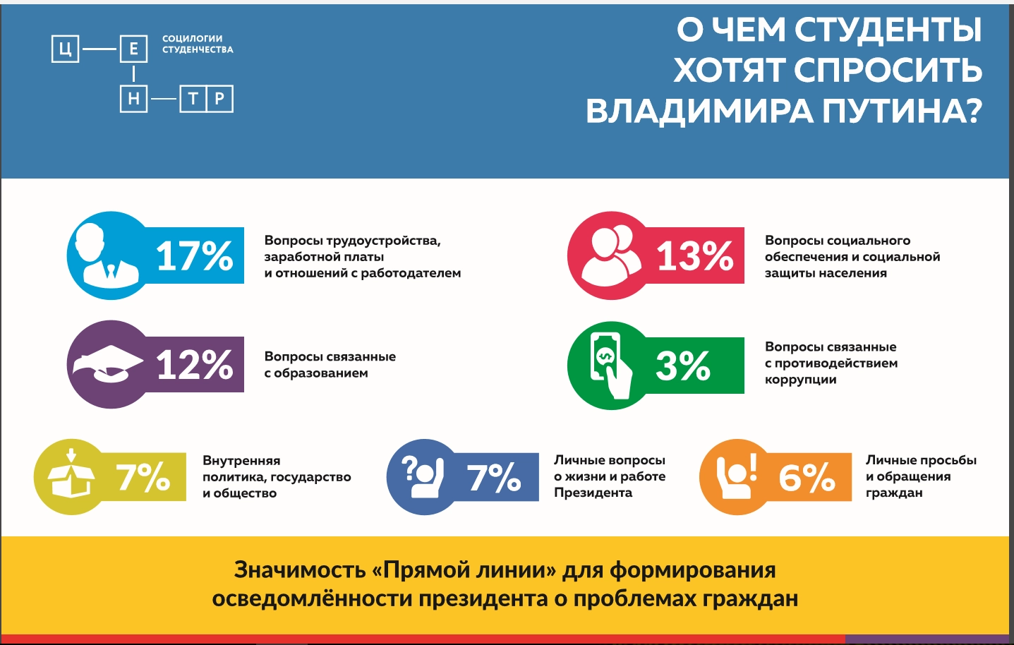 В преддверии прямой линии президента Центр социологии студенчества провел онлайн-опрос учащихся вузов и учреждений среднего профессионального образования с помощью социальных сетей на тему какой вопрос они задали бы Владимиру Путину.