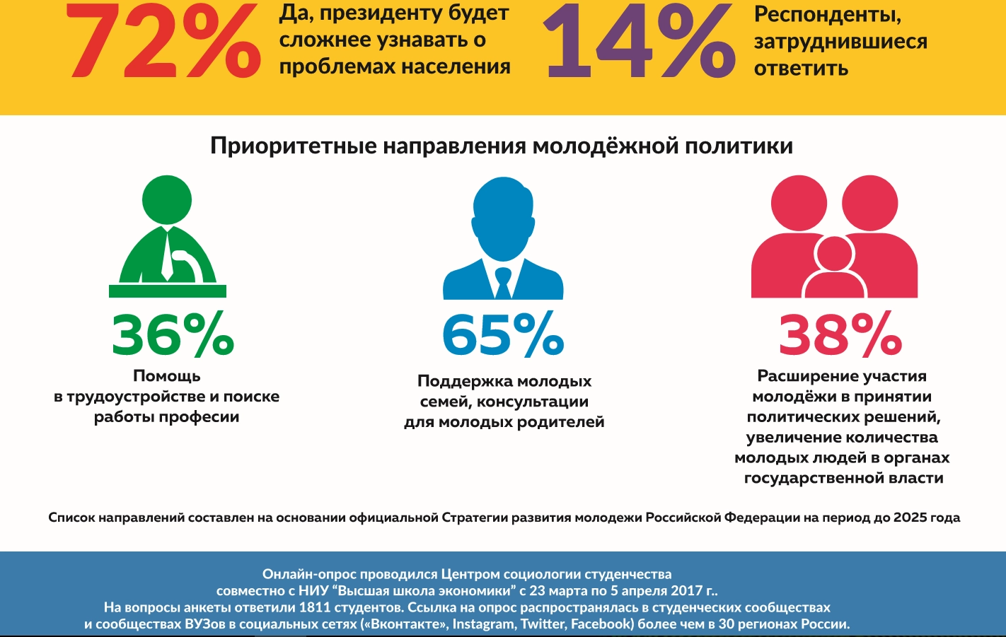 Участники опроса выбрали и приоритетные направления молодежной политики. Так, 65% студентов уверены, что необходимо уделять внимание помощи в трудоустройстве и поиске работы по профессии, 38% — поддержке и консультациям молодых семей, 36% — расширению участия молодежи в принятии политических решений и увеличению количества молодых людей в органах государственной власти