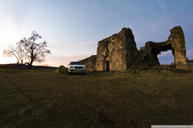 Вскоре все дела в Украине были сделаны и мы со спокойной совестью продолжили путешествие. По пути к границе с Абхазией произошло много забавных случаев. Мы и тонули в пожарном пруду завода ТАГАЗ, и меняли радиатор вместе с патрубками системы охлаждения прямо на дороге в снегопад, и разгружали половину машины при обыске в районе Туапсе, и, наконец, пытались прорваться сквозь город-стройку Сочи. В итоге, добрались. Абхазия встречает туриста двумя "достопримечательностями". Первое что бросается в глаза, это обилие заброшенных после войны строений: