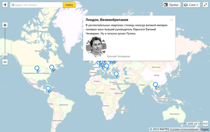 Огромное количество русских людей уехали подальше от ответственности и российских законов, но все равно продолжают участвовать в политической жизни покинутой родины. Мы собрали на одной карте всех оппозиционеров, которые даже «из-за бугра» пытаются свергнуть «кровавый режим»,пишут создатели проекта «Карта русской эмиграции».