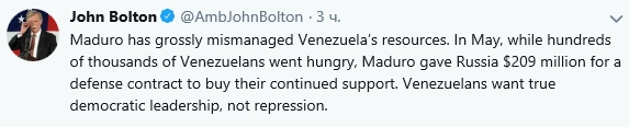 В мае, когда сотни тысяч венесуэльцев голодали, Мадуро заплатил России 209 миллионов долларов за оборонный контракт, чтобы купить ее дальнейшую поддержку, — написал Болтон в своем микроблоге в Twitter.