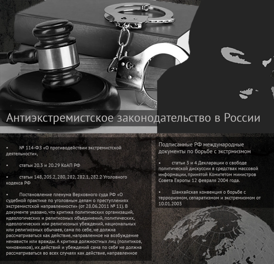 При этом одни эксперты говорят, что существующего в России инструментария недостаточно для успешного противостояния проблеме. Другие, и их большинство, утверждают, что законов вполне хватает, но практика обнажает недостатки в квалификации правоохранителей. Третьи же считают, что с точки зрения юридической техники, антиэкстремистское законодательство РФ не выдерживает критики, поскольку направлено в основном не на действие, а на выражение мнения. А как можно осуждать за помыслы?