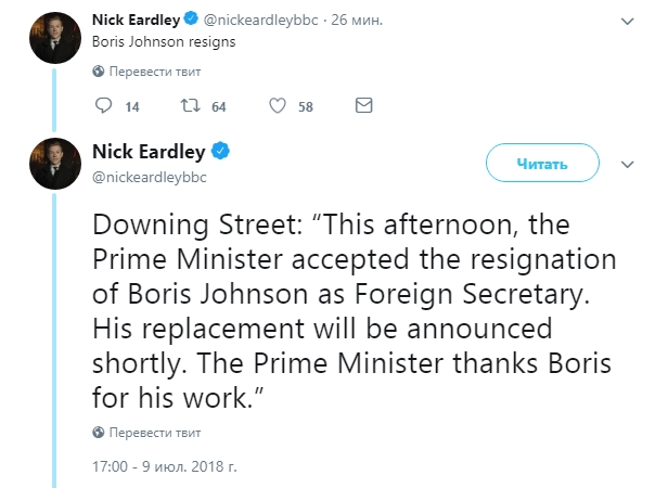 «Сегодня днем премьер-министр приняла заявление об отставке Бориса Джонсона. Имя нового министра иностранных дел будет названо в ближайшее время. Премьер-министр благодарит Бориса за его работу», — приводит слова источника в правительстве Идлей.