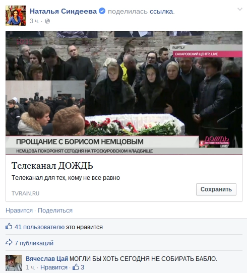 Как всегда «отметился» и телеканал «Дождь». Гендиректор «оптимистичного» Наталья Синдеева разместила на своей странице в Фейсбуке рекламный пост трансляции с панихиды. Однако не забыла Синдеева и о своем кошельке: трансляция доступна только подписчикам телеканала. Отметим, такой подход вызвал волну неодобрительных отзывов в социальных медиа: