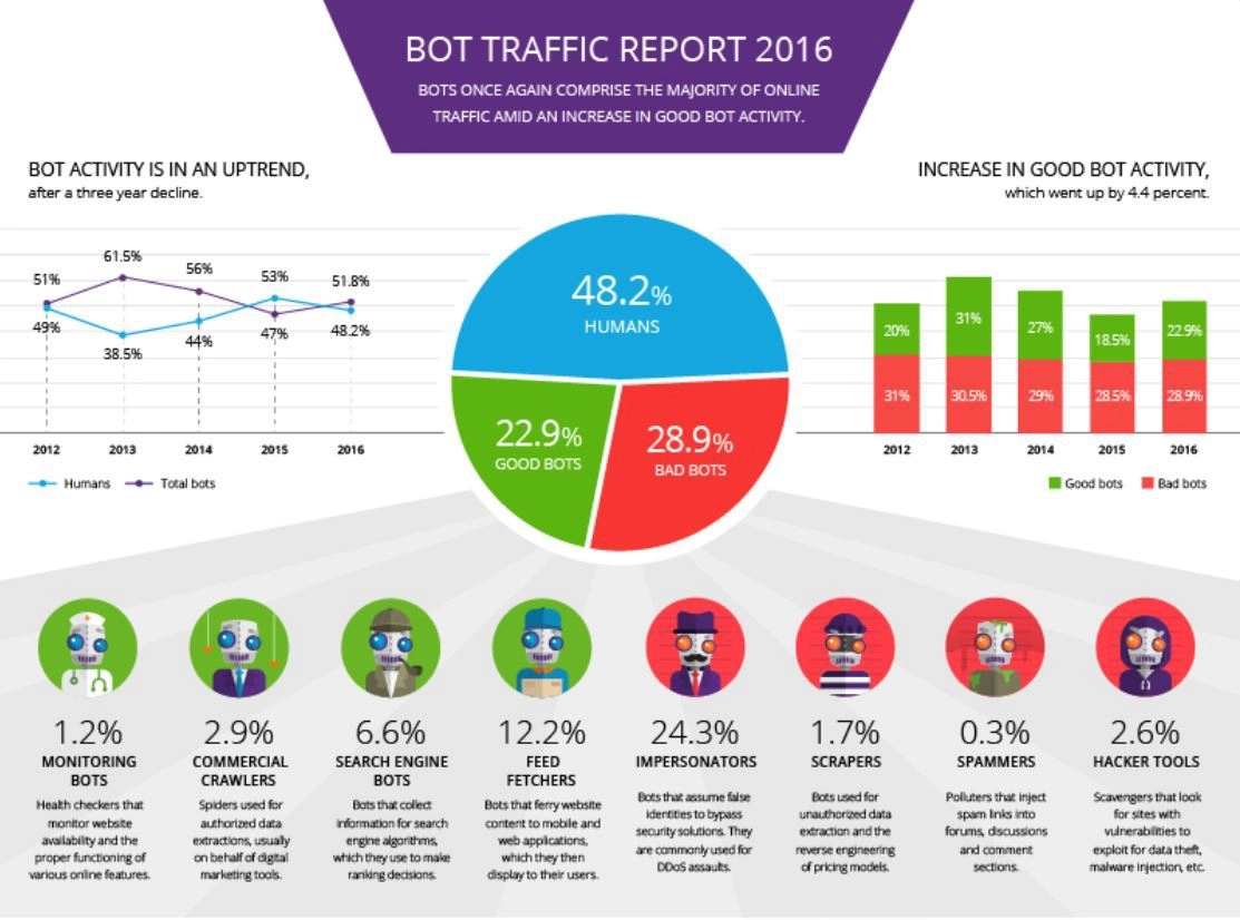 Подробные итоги своего исследования компания представила в виде инфографики. Всех ботов аналитики поделили на «хороших» и «плохих». Первым досталось 22,9% автоматизированного трафика: сюда записывались визиты для анализа сайтов, сбора и обработки информации и другой полезной законопослушным гражданам работы. «Плохие» боты заходили на сайты в рамках DDos-атак и прочего криминала, их доля оказалась выше — 28,9%.