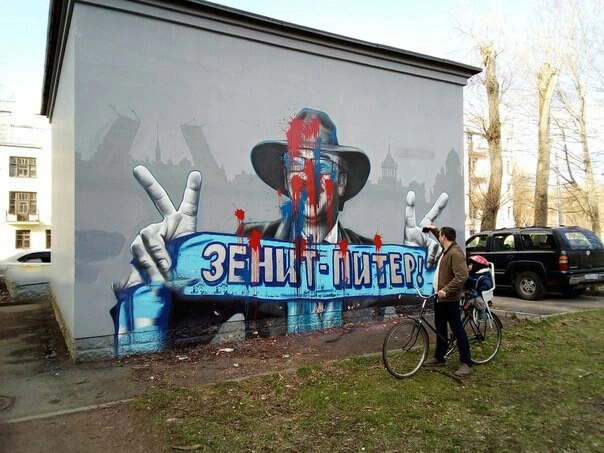 «Зенит» и ЦСКА в воскресенье сыграли вничью в 28-м туре чемпионата России. После чего граффити с Боярским, держащим шарф петербургского футбольного клуба, забросали синей и красной краской. Примечательно, что синий и красный — являются основными цветами столичного клуба.