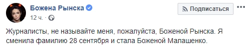 На своей странице в Facebook она попросила не называть ее больше Рынска.