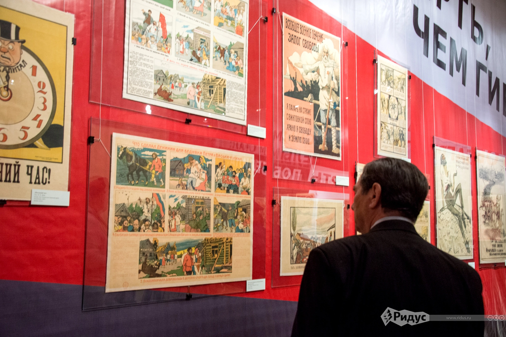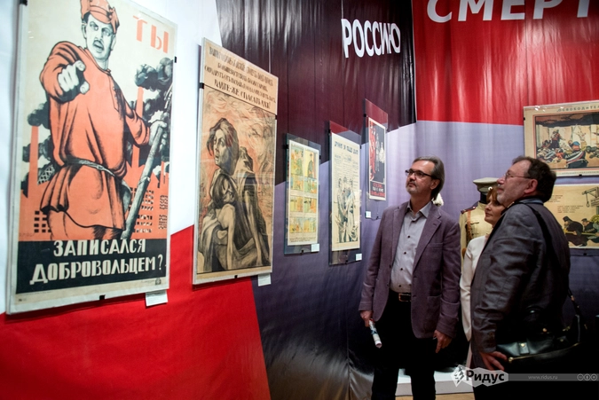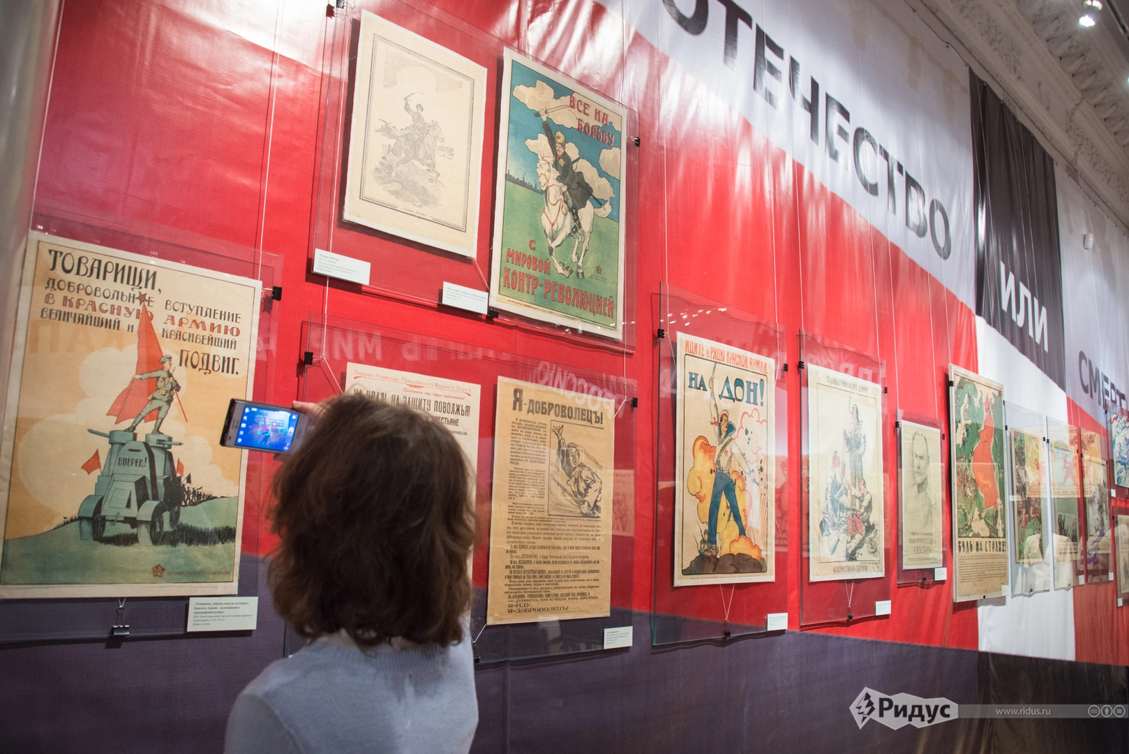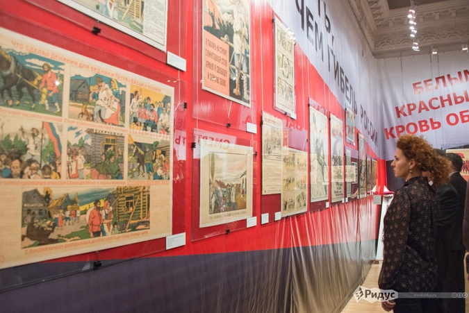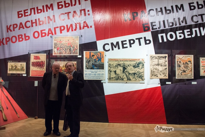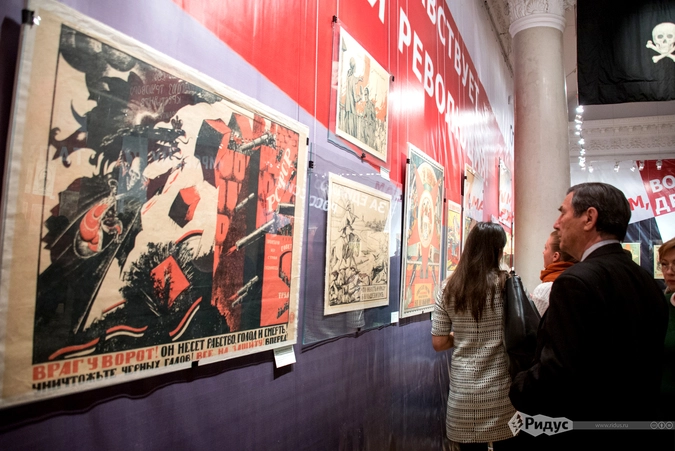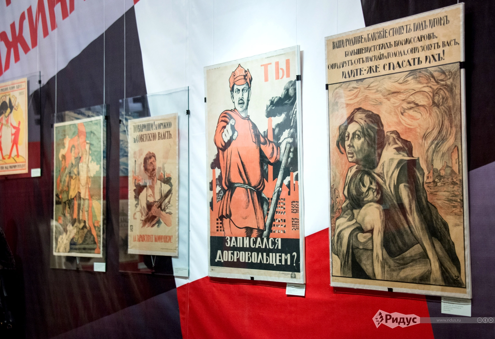 В четверг, 30 октября Музее современной истории России открылась выставка, посвященная агитационному плакату времен Гражданской войны 1918−1922 гг. На экспозиции представлены раритеты из фондов Музея современной истории России: коллекция уникальных плакатов «красного» и «белого» движений, боевое оружие, знамена и форма противоборствующих сторон.