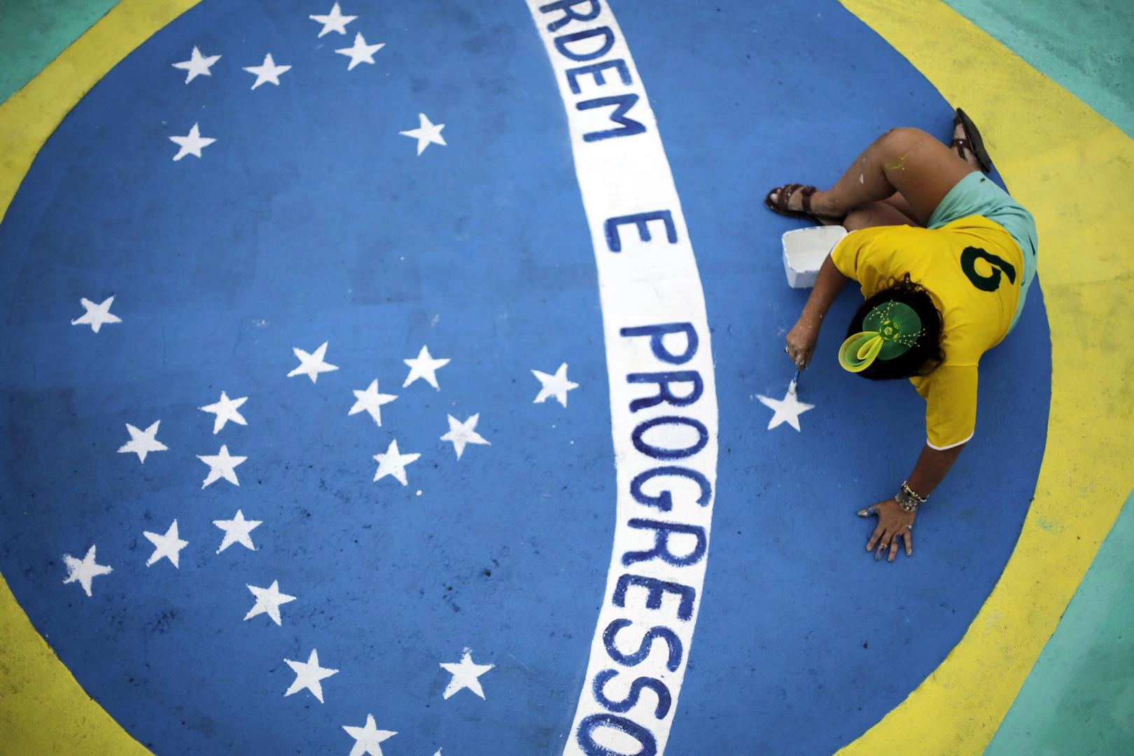 Женщина рисует бразильский флаг. Так украсили бразильские улицы перед чемпионатом мира.