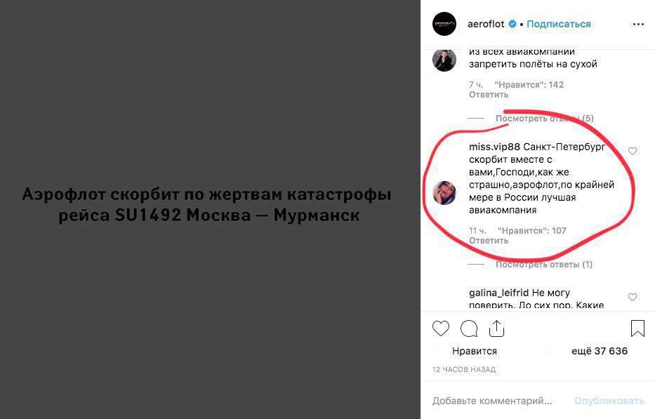 После страшной трагедии, произошедшей в столичном аэропорту Шереметьево в воскресенье, 5 мая, с самолетом «Аэрофлота» SSJ100 и унесшей как минимум 41 жизнь, в официальном аккаунте авиакомпании под постом, в котором говорится, что «Аэрофлот скорбит по жертвам катастрофы», появились весьма интересные комментарии.
