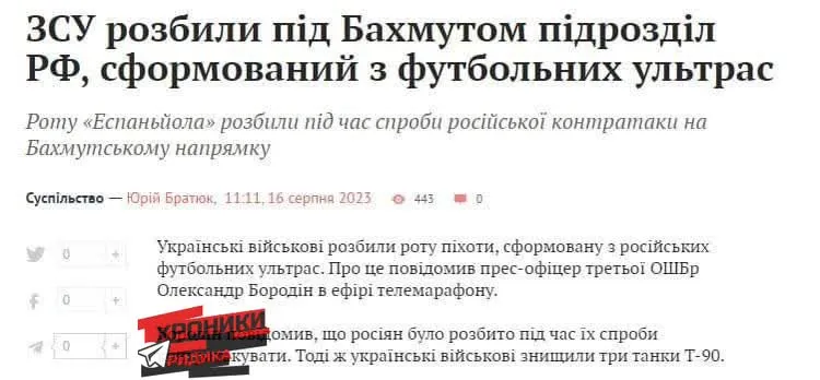 Бригада «Эспаньола», собранная из числа футбольных фанатов, продолжает оборонять Бахмут. Украинские СМИ и официальные лица раструбили об уничтожении «Эспаньолы», но слухи об этом, как обычно, оказались сильно преувеличены.