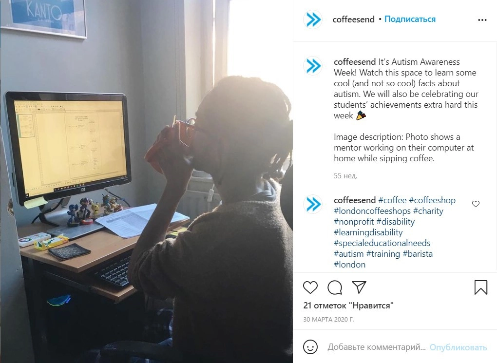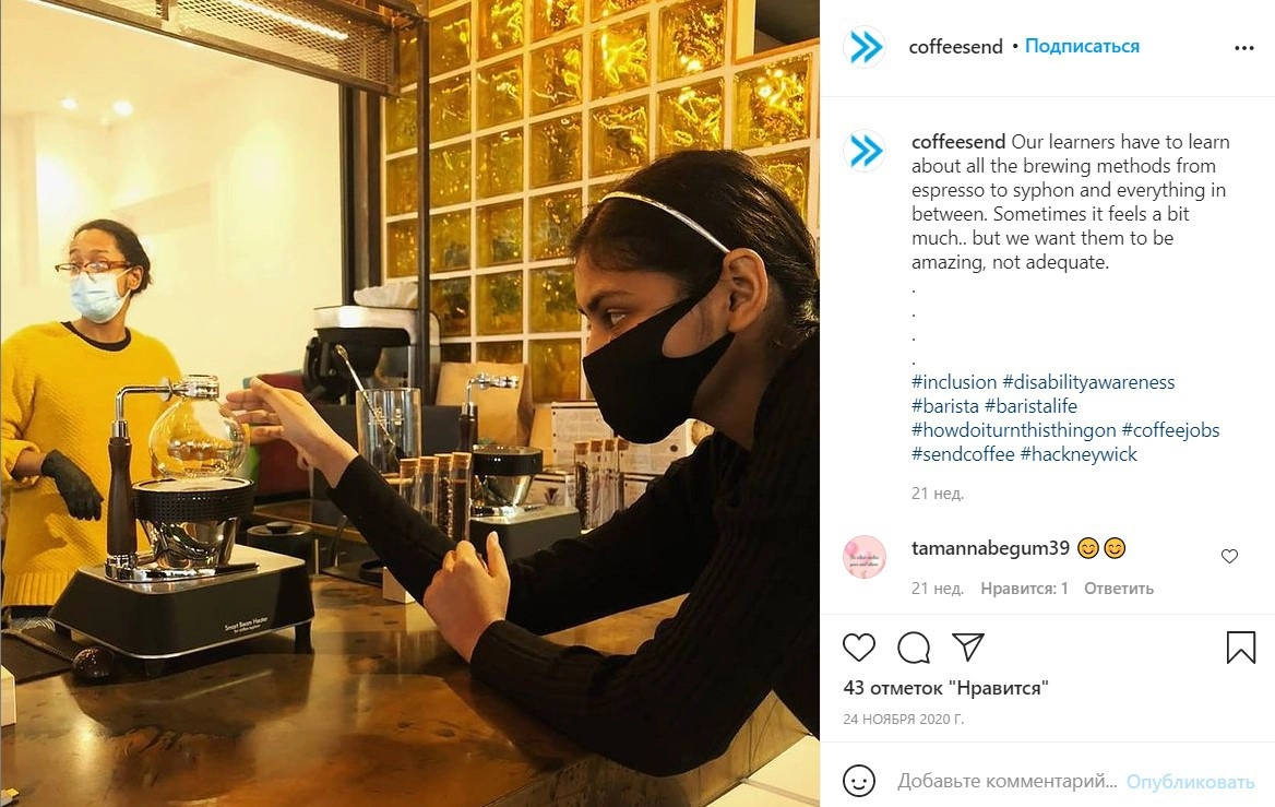 SEND Coffee работает с очень широким кругом лиц с ограниченными возможностями. Каждый, кто приходит к ним на обучение, может рассчитывать на успех в поисках работы. Они не отказывают никому. Во время ограничений из-за пандемии коронавируса обучение продолжалось дистанционно.