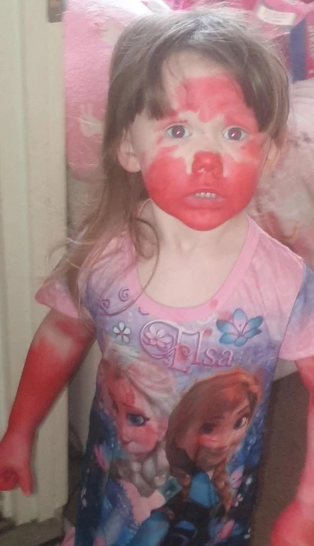 Британка проснулась после дневного сна и заметила непонятные красные пятна в коридоре, след которых вел в комнату двухлетней Харпер-Джин. Открыв дверь, Киара чуть не испытала сердечный приступ — ее дочка была почти полностью покрыта красной краской.