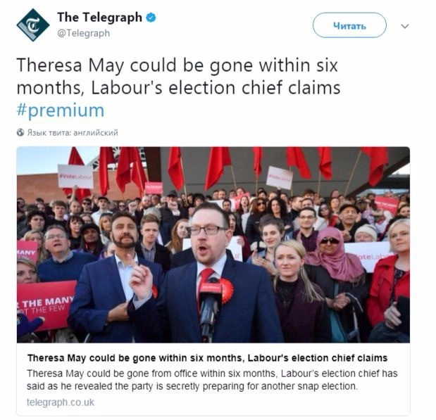 Представитель теневого правительства Эндрю Гвинн предположил, что уже через шесть месяцев британский премьер-министр Тереза Мэй покинет свой пост.