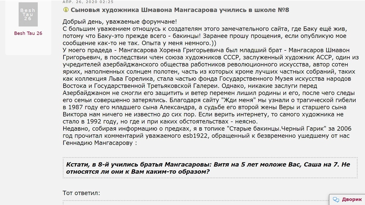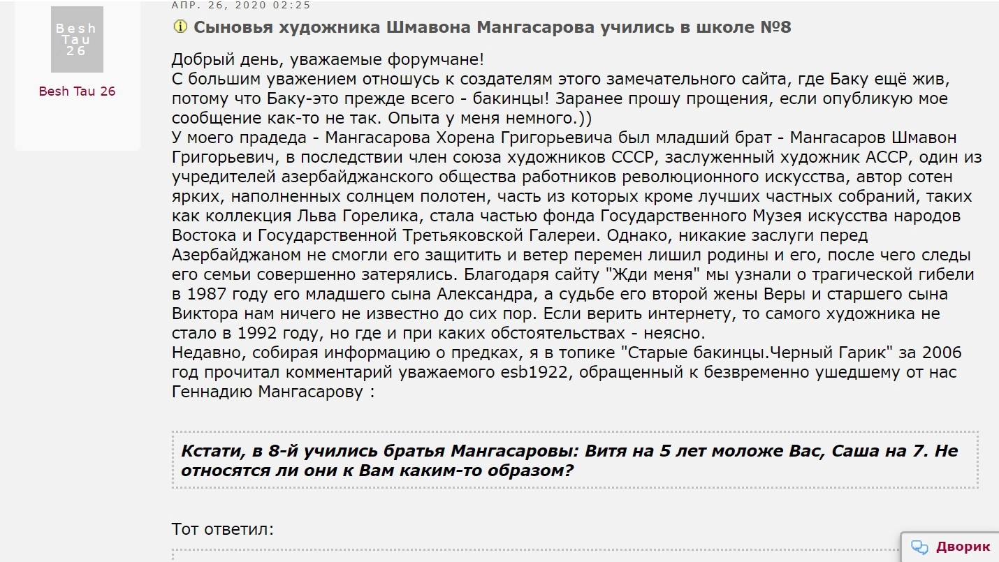 «Никакие заслуги перед Азербайджаном не смогли его защитить, и ветер перемен лишил его родины, после чего следы его семьи совершенно затерялись. Благодаря сайту „Жди меня“ мы узнали о трагической гибели в 1987 году его младшего сына Александра; о судьбе его второй жены Веры и старшего сына Виктора нам ничего не известно до сих пор. Если верить интернету, то самого художника не стало в 1992 году, но где и при каких обстоятельствах — неясно», — пишет на форуме бакинцев пользователь, называющий себя родственником Мангасарова.