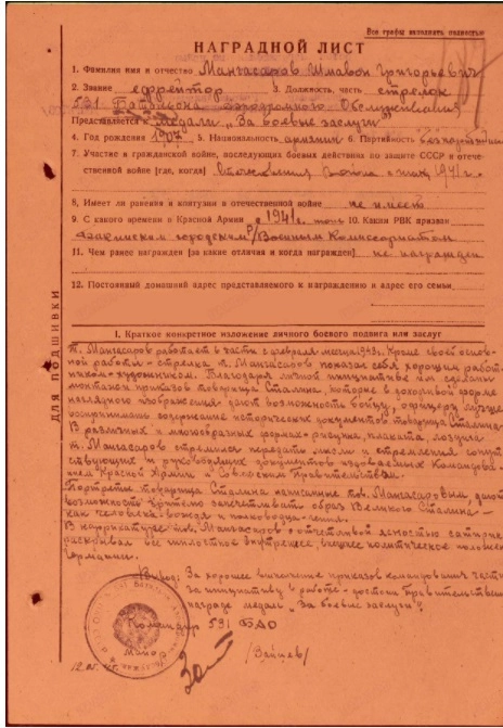 Кроме своей основной работы — стрелка — товарищ Мангасаров показал себя хорошим работником-художником. Благодаря личной инициативе им сделаны монтажи приказов товарища Сталина, которые в доходчивой форме наглядного изображения дают возможность бойцу, офицеру лучше воспринимать содержание исторических документов товарища Сталина. В различных и многообразных формах — рисунка, плаката, лозунга — товарищ Мангасаров стремился передать мысли и стремления сопутствующих и руководящих документов, издаваемых Командованием Красной Армии и Советским Правительством. Портреты товарища Сталина, написанные товарищем Мангасаровым, дают возможность запечатлевать образ Великого Сталина — как человека-вождя и полководца-гения. В карикатуре товарищ Мангасаров с отчетливой ясностью сатирика раскрывал все гнилостное внутреннее и внешнее политическое положение Германии. Командир 531-го БАО майор Зайцев.