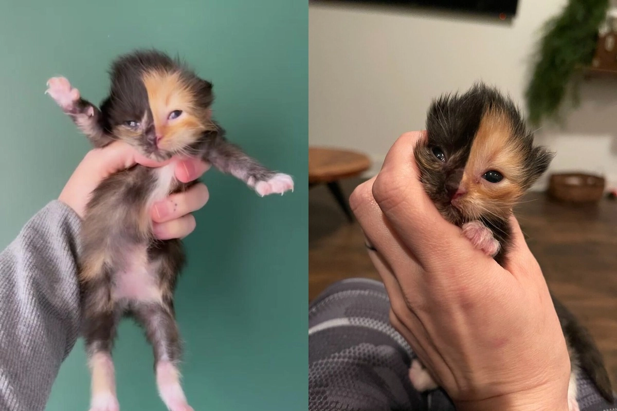Кики призналась, что когда впервые увидела брошенных котят, то ахнула от удивления: мордочка одно из них имела необычный двуликий окрас. Такое явление называется химеризмом. А вот и котенок-химера, который получил кличку Абрикос.