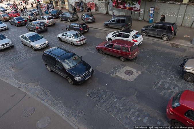 Асфальтовые заплатки на дороге из брустчатки на Пресне. © Илья Варламов