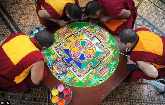 Группа тибетских монахов из буддийского монастыря на юге Индии путешествует по Европе, создавая сакральные символы из цветного песка. Это изображение, которое используется в буддийских и индуистских практиках, называется мандала (ударение на первом или втором слоге, в зависимости от традиции). На фотографиях монахи создают мандалу в знаменитом Солсберийском соборе в Англии.