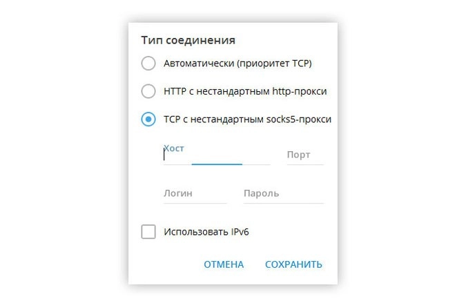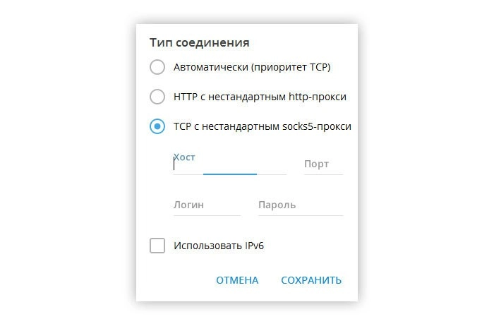В приложении Telegram нужно открыть меню настроек, нажать «default (сейчас TCP)». Затем перейти на вкладку «Тип соединения» и выбрать «TCP socks5 proxy». После этого ввести адрес прокси-сервера и соответствующий порт. Затем нужно отметить «Использовать IPv6» и сохранить данные.
