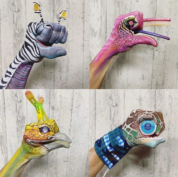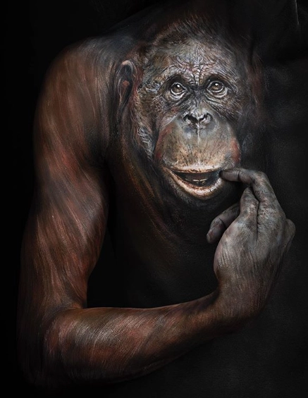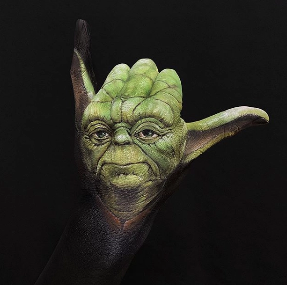 Так, по задумке талантливого мастера, кисть руки становится частью лица или превращается в малыша Йоду, а на теле человека возникает орангутан.