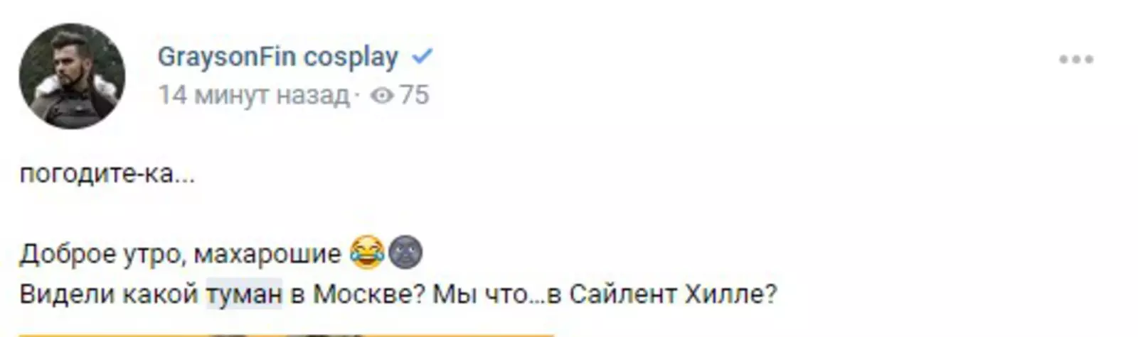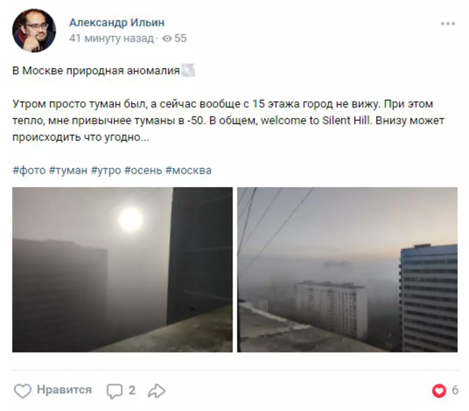 Тот факт, что окутавший Москву и окрестности туман долгое время не спешит рассеиваться, насторожил многих пользователей Сети, вызвав ассоциации с Сайлент-Хиллом и другими популярными образами жанра ужасов. Дымка в столице послужила источником вдохновения для фотографов.