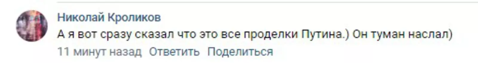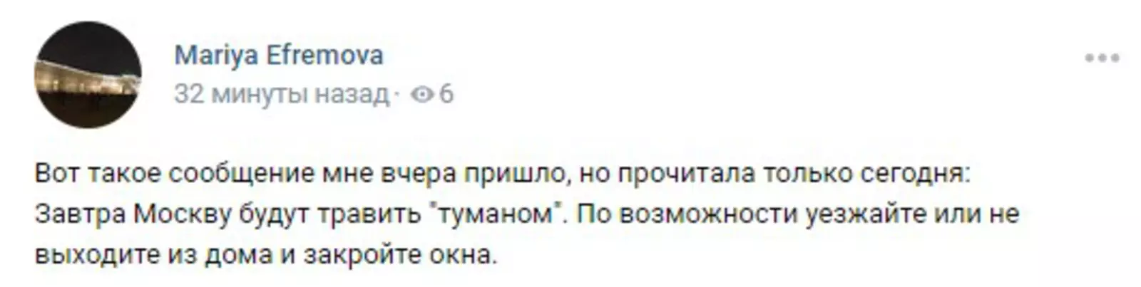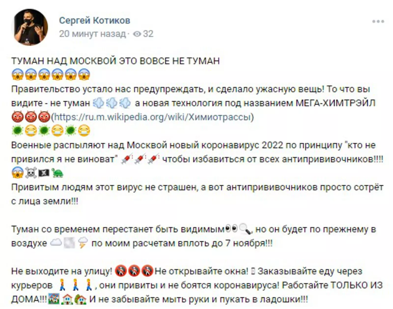 В то же время в лентах соцсетей появилась масса пугающих комментариев с утверждениями, что туман на самом деле представляет собой «химическую атаку» и что москвичей «травят химтрейлами» с неясной целью — как утверждают некоторые ковид-диссиденты, чтобы убедить прививаться.