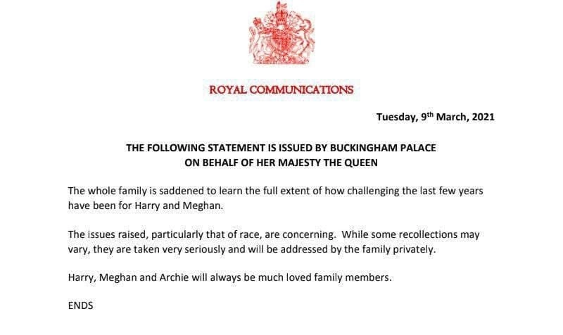 Британская королевская семья с сожалением узнала о том, насколько непростыми были последние несколько лет для принца Гарри и Меган Маркл, говорится в заявлении, распространенном канцелярией королевы Великобритании Елизаветы II.