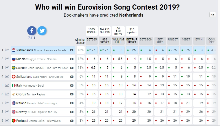 По последним данным, опубликованным на сайте «Евровидения», статус фаворита получил представитель Нидерландов Дункан Лоренс. Его шансы на победу составляют 18%.