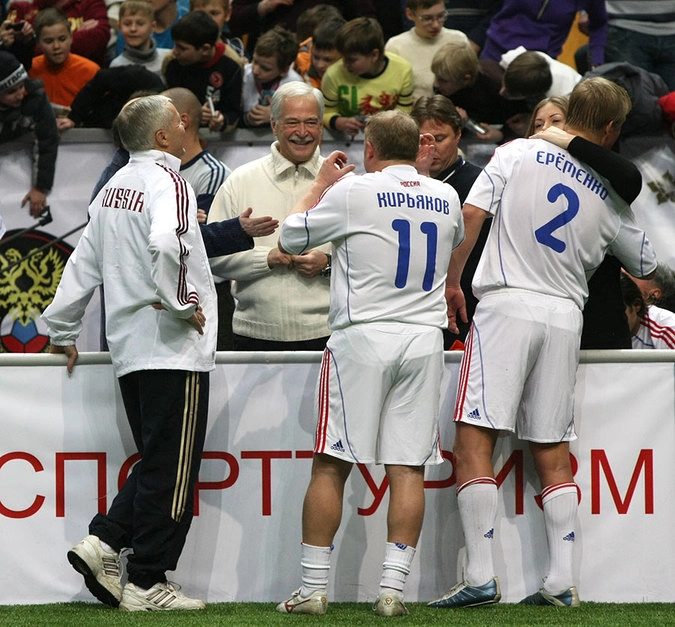 Борис Грызлов поздравляет игроков российской сборной после финала "Кубка легенд" в 2010 году. © Владимир Федоренко/РИА "Новости"