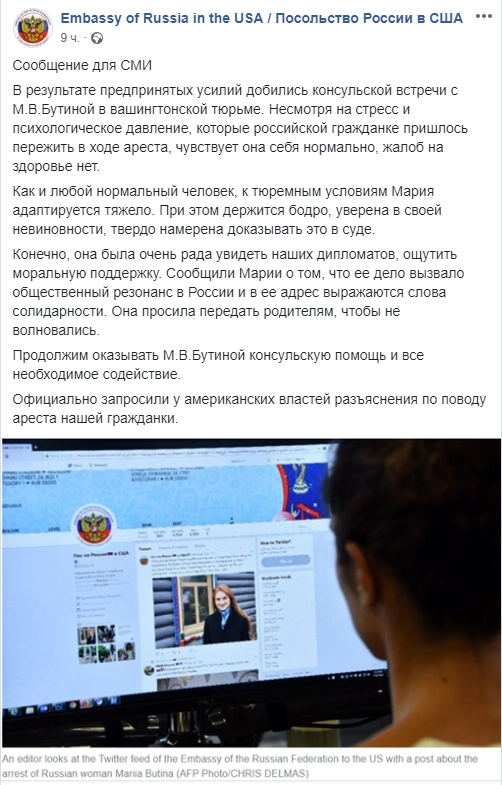 Представители посольства сообщили Бутиной, что ее дело вызвало общественный резонанс в России. Она попросила передать родителям, что с ней все в порядке.
