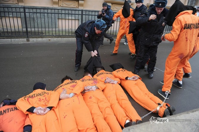 Не менее запоминающейся выдалась акция протеста у здания американской дипмиссии, участники которой решили напомнить президенту США о десятках публичных обещаний закрыть тюрьму, ставшую символом пыток, неоправданного насилия и пренебрежения США к международному праву. Активисты в одежде с надписью Guantanamo легли на асфальт у здания диппредставительства, надев на головы черные мешки, а на ноги — цепи.
