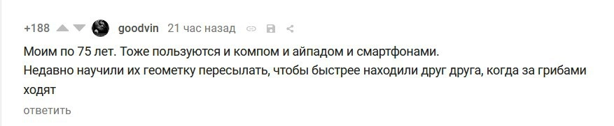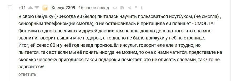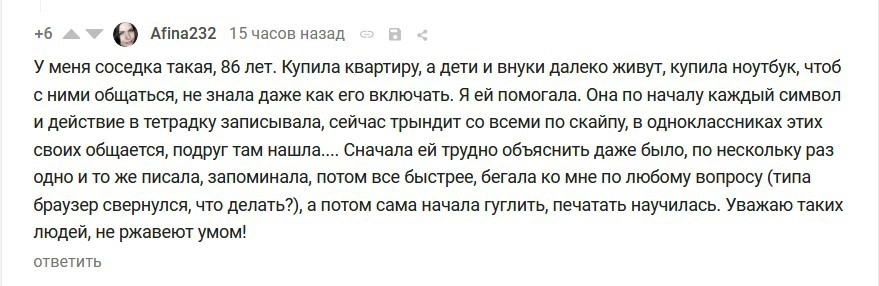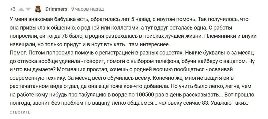 В ответ на рассказ девушки пользователи поделились своими историями о людях в возрасте, которые благодаря освоению смартфонов и компьютеров смогли найти себе новых друзей, научились общаться с родственниками или просто придумали себе развлечение, которое помогает им жить полной жизнью.