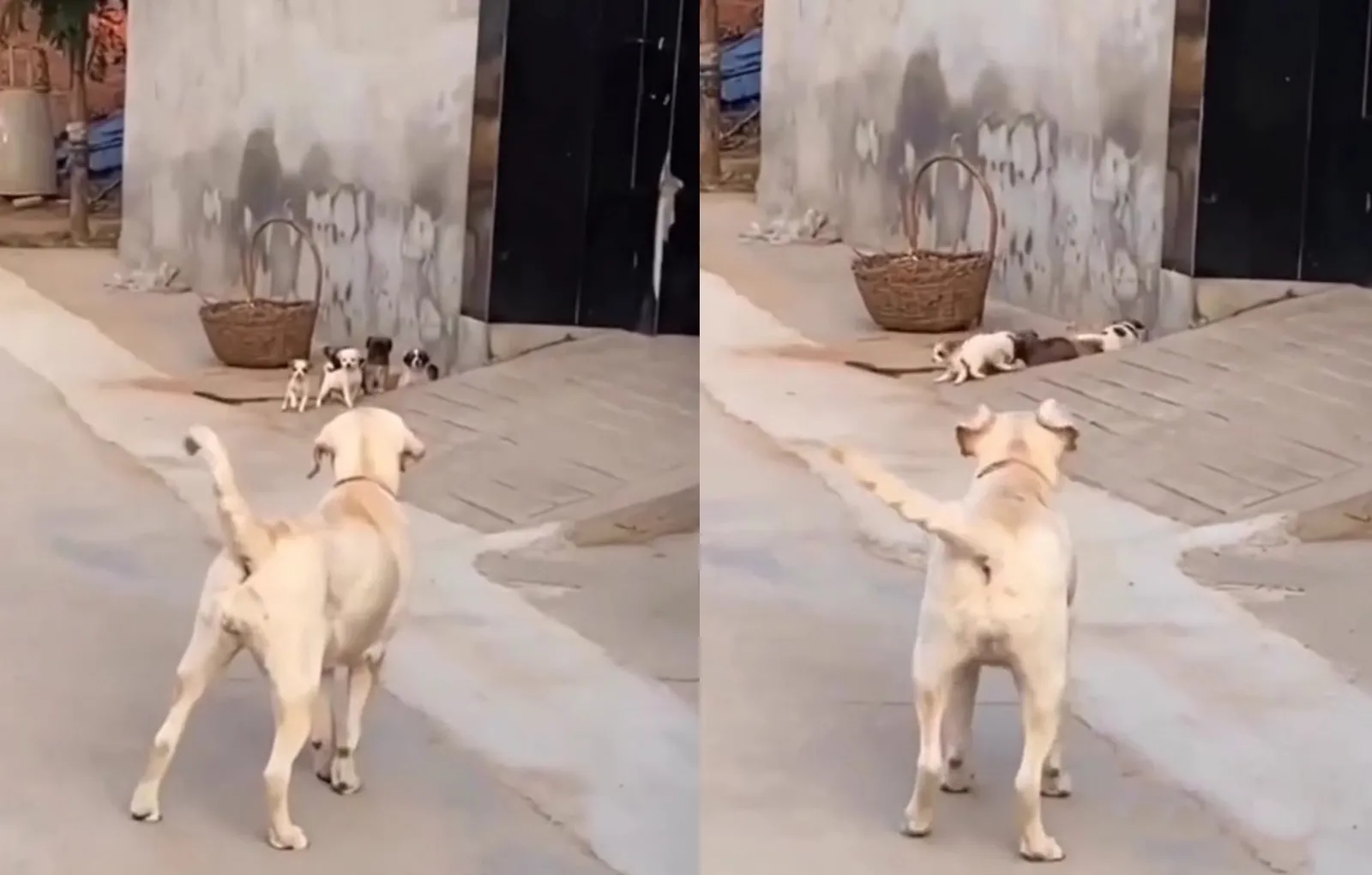 Когда хвостатый папа грозно и громко гавкнул, озорные малыши сразу же забыли, что планировали натворить, и побежали домой со всех лап. И это выглядело невероятно забавно и мило.