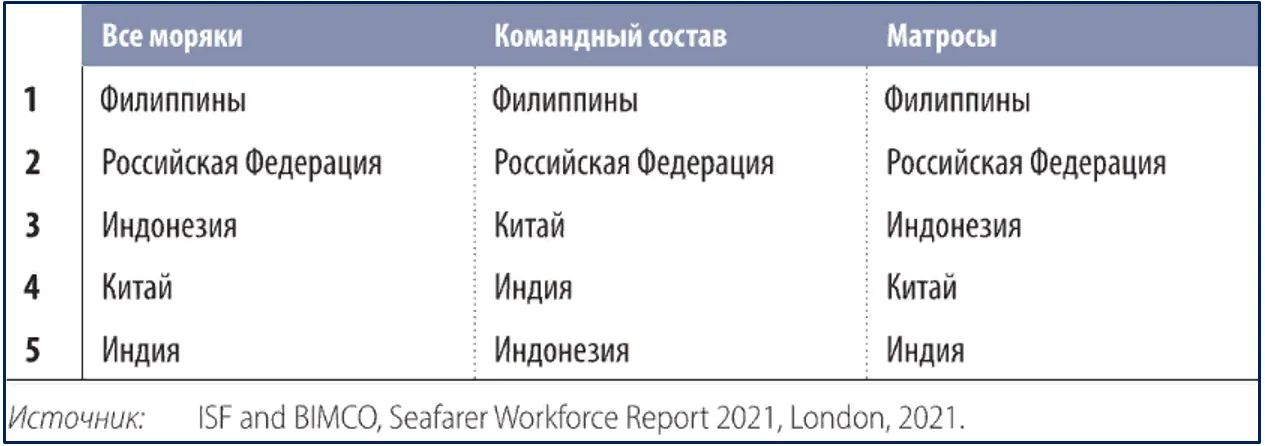 Ну и ещё один интересный показатель, характеризующий уровень морского образования. По данным Обзора морского транспорта за 2021 год (издание Конференции ООН по торговле и развитию), в мире насчитывается 1 892 720 моряков. Из них 857 540 человек относятся к командному составу, а 1 035 180 — к рядовому (квалифицированные специалисты, выполняющие вспомогательную работу). Пять крупнейших стран их происхождения, на долю которых приходится 44% от общей численности, показаны в таблице. В ней не нашлось места ни американским, ни другим апологетам морского дела.