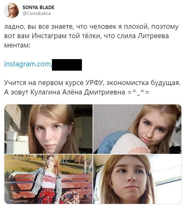 Либертарианская дура Соня Блейд сливает акки девушки, помогавшей следствию. Но лишь для того, чтобы другие не покупали с ней наркотики. Забота какая, — пишет телеграм-канал «Выпускайте кракена».