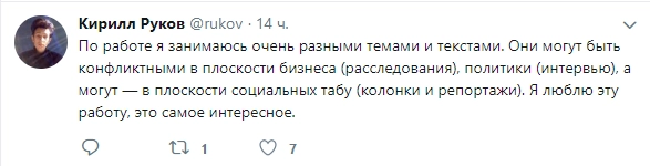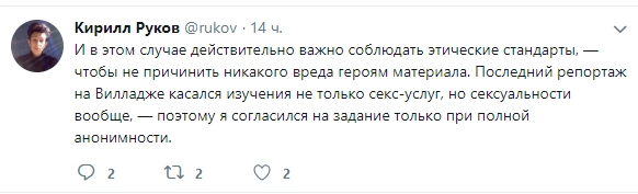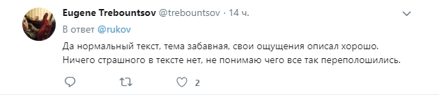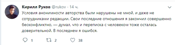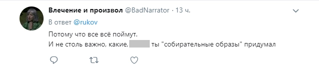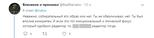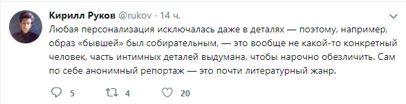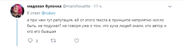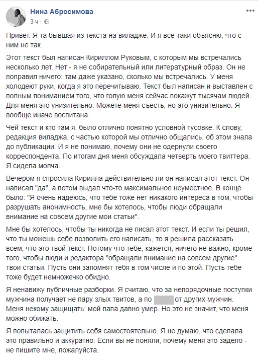 «Этот текст был написан Кириллом Руковым, с которым мы встречались несколько лет. Нет — я не собирательный или литературный образ. Он не поправил ничего: там даже указано, сколько мы встречались. У меня холодеют руки, когда я это перечитываю. Текст был написан и выставлен с полным пониманием того, что голую меня сейчас покажут тысячам людей. Для меня это унизительно. Можете меня съесть, но это унизительно. Я вообще иначе воспитана. Чей текст и кто там я, было отлично понятно условной тусовке», — написала журналистка.