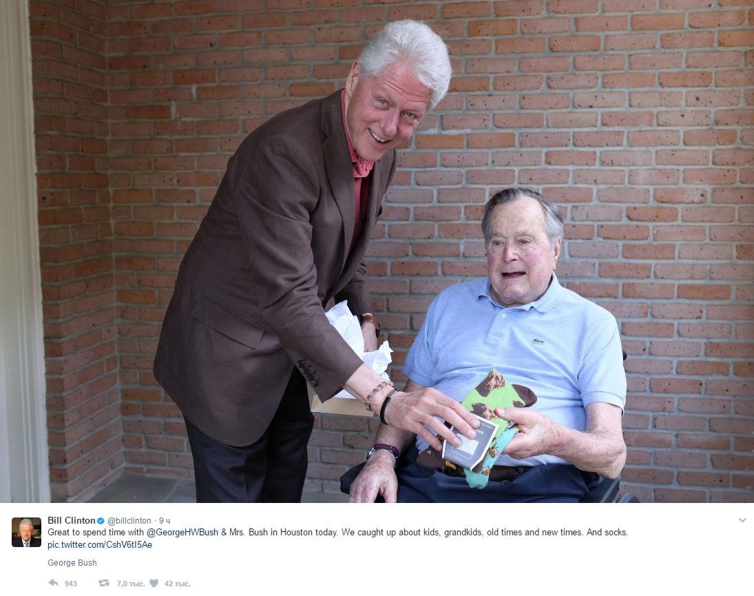Экс-президент США Билл Клинтон подарил смешные носки своему предшественнику, бывшему американскому лидеру Джорджу Бушу-старшего. Об этом он написал в своем микроблоге: «Было здорово провести время с Джорджем Бушем-старшим и миссис Буш в Хьюстоне. Мы поговорили о детях, внуках, прежних и новых временах. И носках».