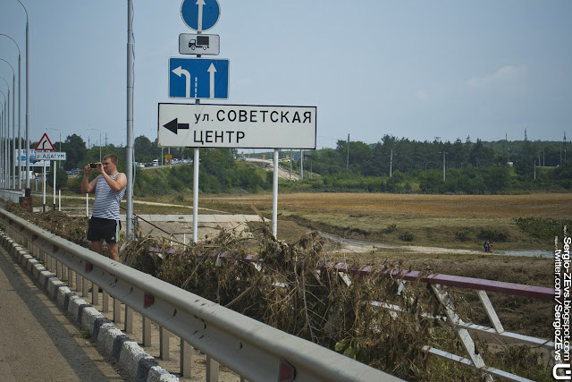 Мост через реку Неберджай ниже ее слияния с рекой Богаго, уровень около 7 метров (вода подмыла насыпь, но не сам мост).
