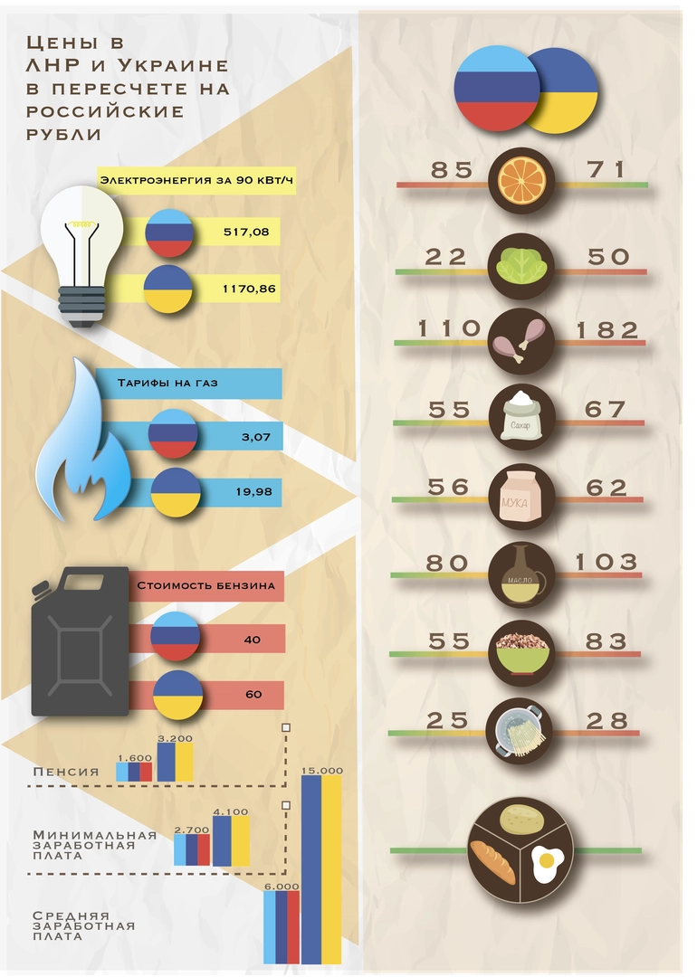 Гречка: 55−56 рублей в Луганске, в Киеве — 83 рубля. Макароны: в ЛНР — 25 рублей, на Украине — 28. Стоимость куриных яиц, картофеля и хлеба в соседних государствах практически одинаковая.