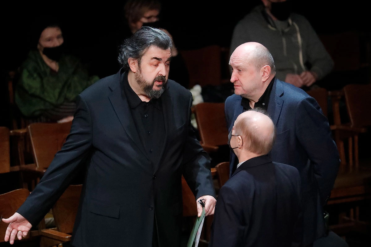 Ректор Школы-студии МХАТ, актер Игорь Золотовицкий, режиссер Сергей Женовач и актер Авангард Леонтьев (слева направо) во время церемонии прощания с актером Андреем Мягковым в МХТ имени А.П.Чехова