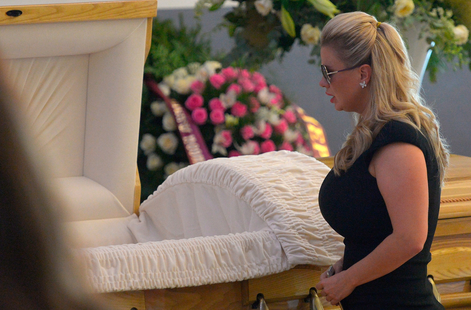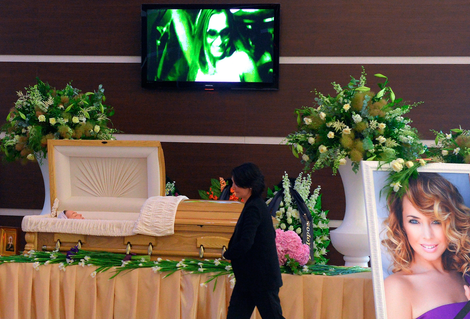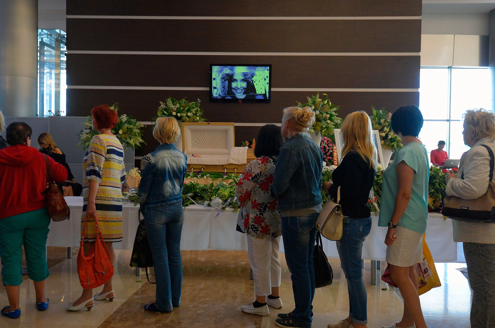 Гроб поставлен в холле концертного зала. Вокруг гроба стоят вазы и венки, звучит музыка, а на экране транслируются фотографии и кадры из клипов певицы.