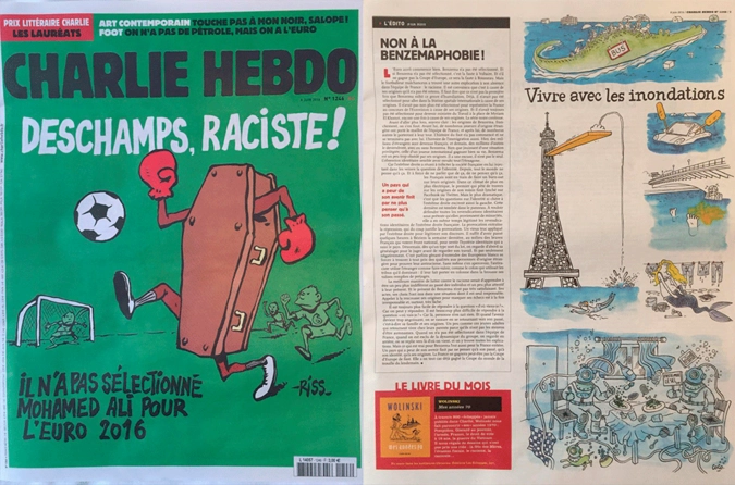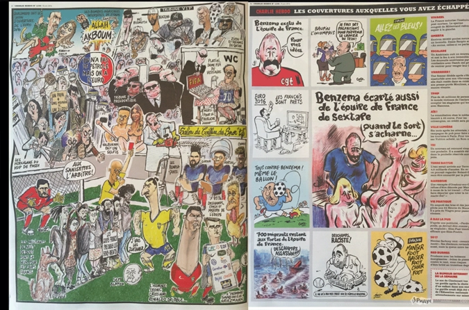 В преддверии чемпионата Европы по футболу 2016 скандальный сатирический журнал Charlie Hebdo выпустил номер с очередными карикатурами, полностью посвященный предстоящему событию.