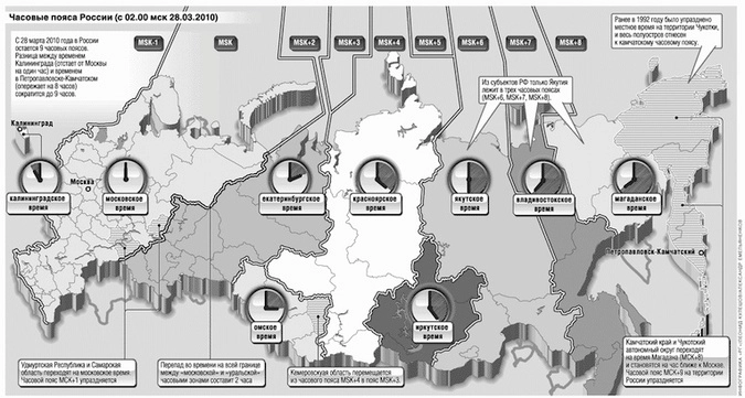 Самыми дальними зонами от Москвы - плюс 8 часов к московскому времени – стали Камчатка, Магадан, Сахалин, сообщает ИТАР-ТАСС.