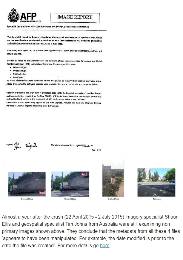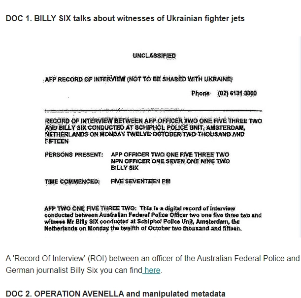 Два из этих документов имеют отношение к австралийской полиции. Один из них — стенограмма беседы немецкого независимого журналиста Билли Сикса с полицейскими о свидетелях, которые утверждают, что видели в день трагедии в небе украинские истребители. Второй — отчет экспертов Шона Эллиса и Тима Джонса. Из него следует, что фотографии «Бука», выдвигающегося на позиции, с которых якобы был сбит боинг, были отредактированы.