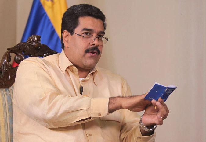 Вице-президент Венесуэлы Николас Мадуро рассказывает о переносе президентской присяги с Конституцией в руках. © Reuters