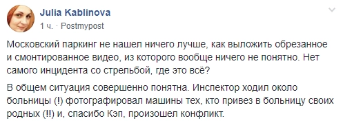 В Сети появилось видео, снятое сотрудником Моспаркинга, который выстрелил водителю в лицо из газового пистолета. Ролик опубликован на странице Московского парковочного пространства в Facebook.